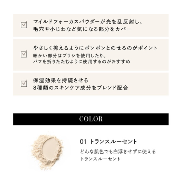 また、マイルドフォーカスパウダーが光を乱反射し、毛穴や小じわなど気になる部分をカバー。