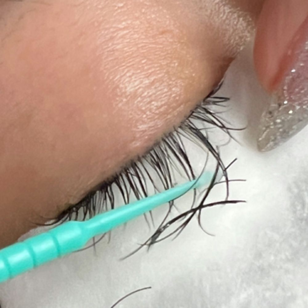 1.リムーブしたいエクステンションをマイクロブラシや綿棒にのせ、周りのエクステンションや皮膚に付かないよう、グルー接着部分に優しく塗布して下さい。