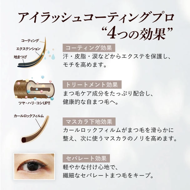 まつ毛ケア成分が脱毛を防ぎ、乾燥やまつエクによるダメージをケアしながらツヤを与え、まつ毛そのものまでリペアします。