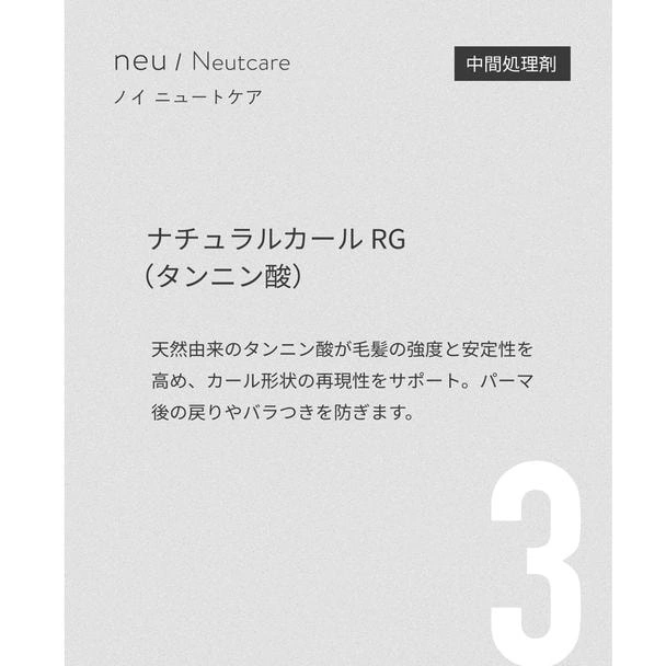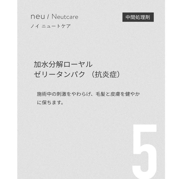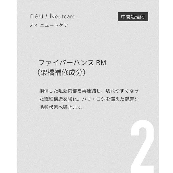 ノイ ニュートケアは、還元後のデリケートな毛髪内部に必要な栄養と補修成分を補いながら、次の酸化工程をより効果的に行える状態へ導くために設計された、中間処理専用の美容液処方です。